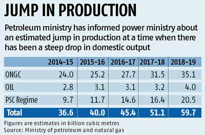 The petroleum ministry has informed the power ministry about the estimated jump in production at a time when there has been a steep drop in domestic output, leaving 24,000 Mw of gas-based power capacity stranded. The two ministries are also working on a strategy to pool gas prices, to resolve differences between stakeholders in oil and power sectors over the new gas price.